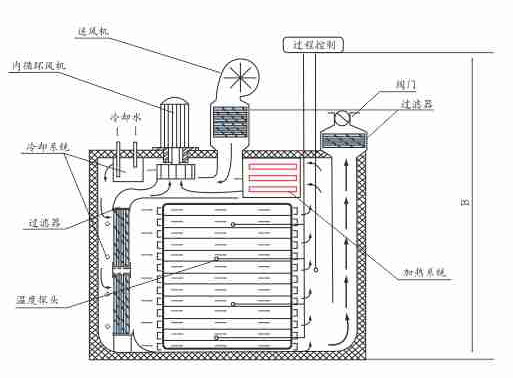 工作原理: 將裝滿物料的烘盤、瓶子或小車放入箱內,啟動PLC可編程序控制系統,內循環風機工作、加熱、蝶閥同時開啟、干燥箱迅速升溫。在內循環風機作用下,干熱空氣通過耐高溫高效過濾器進入箱體,在微調節板作用下形成一個均勻分布空氣向箱體內傳遞,干燥空氣吸收瓶子(物料、物品)表面的水份,進入加熱通道蒸發排出、干空氣在風機作用下定向循環流動,水蒸氣排出。隨著水蒸氣逐漸減少、同時間隙性補充新鮮過濾空氣,箱體內呈微正壓狀態,恒溫結束,過程控制完畢。開啟送風或(進水)強制冷卻,自動蝶閥進入關閉狀態,聲光提示開門出瓶。
